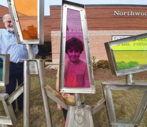 Unity, By Nathan Pierce, is the perfect piece for its spot welcoming students at the entrance of Northwood Elementary. Locked arm in arm, this glistening family of steel and colored plexiglass inspire kids to bike, play, and even sing. A heart at the center of one of the figures is an emblem for the love this piece is meant to inspire in children every day.